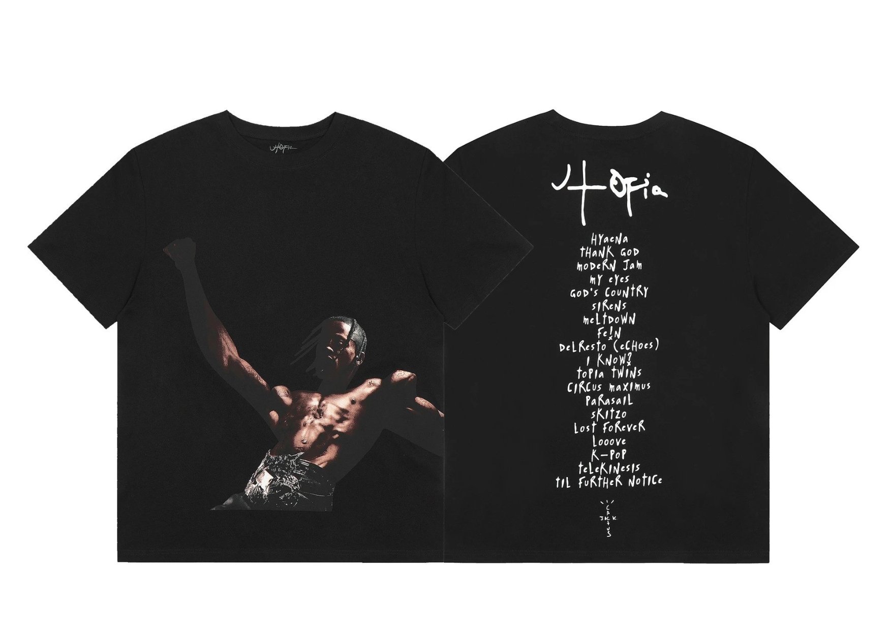 These shirts are all official or tour-inspired merchandise for Travis Scott, specifically spanning his Astroworld and Utopia eras. They feature his signature "Cactus Jack" aesthetic, which blends lo-fi graphics, distorted imagery, and bold typography